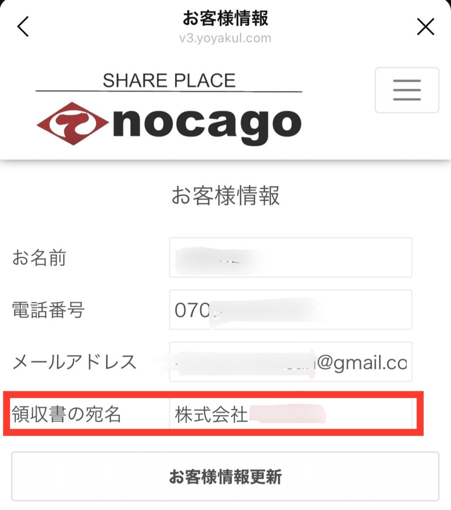 「領収書の宛名」を欲しい名前に変更し、「お客様情報更新」でお好きな宛名にすることが可能です。